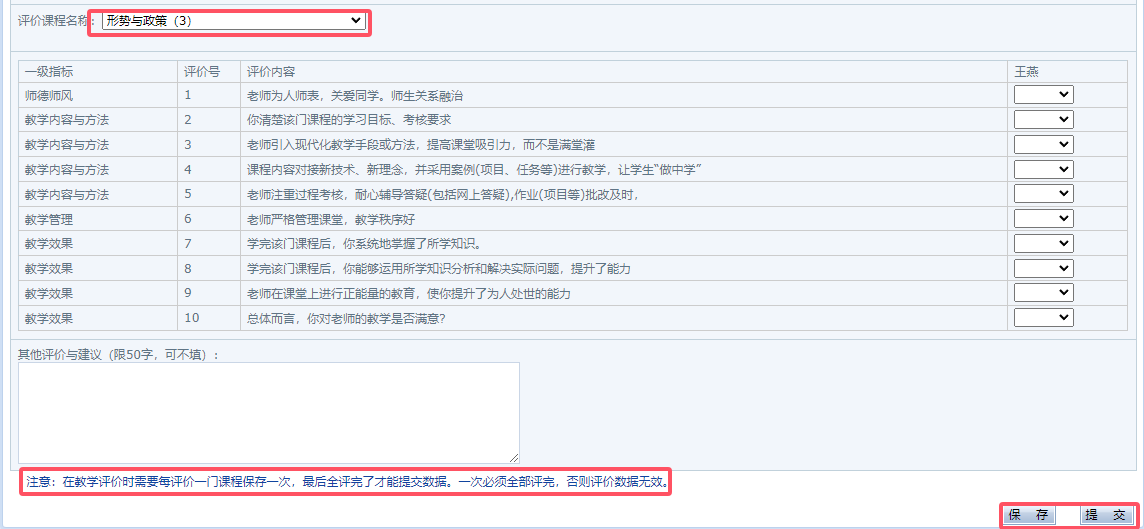 3.分别单击每一门课程,系统自动弹出评教选项卡(请注意允许浏览器弹出窗口,建议使用360浏览器兼容模式或QQ浏览器兼容模式),每评完1门课程后,单击“保存”按钮保存当前课程评教信息。